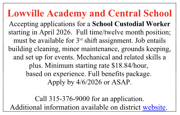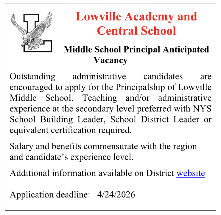 For more information, please see the Employment Opportunities on the district site. https://www.lowvilleacademy.org/43468_2
